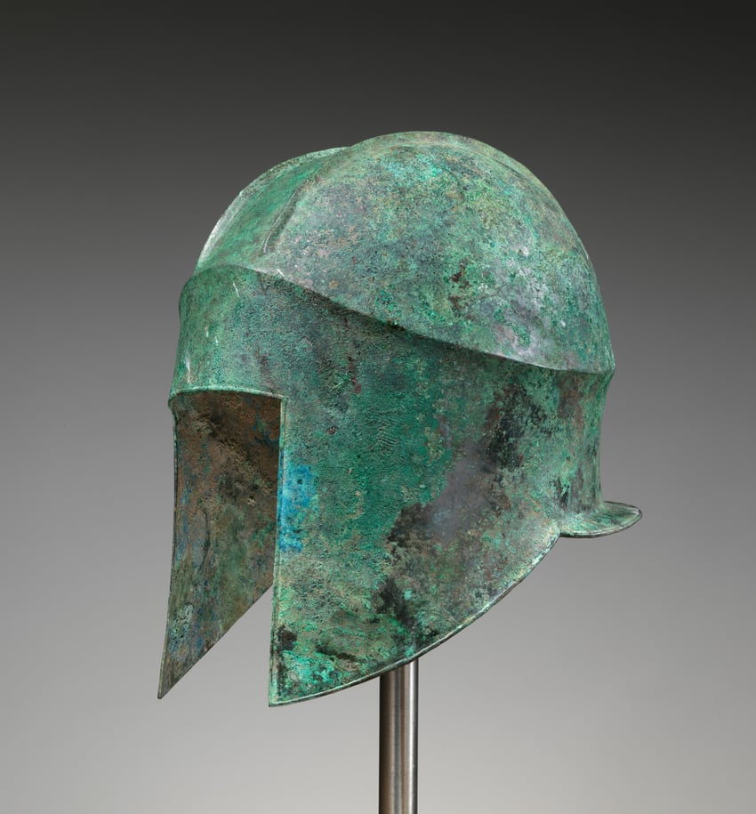 The Illyrian helmet was a popular type in the Classical period. A similiar helmet with the elaborate plumed crest that was once attached between the ridges on the top appears on silver tetraobols of the Macedonian King Perdiccas II (ca. 454-413 B.C.).