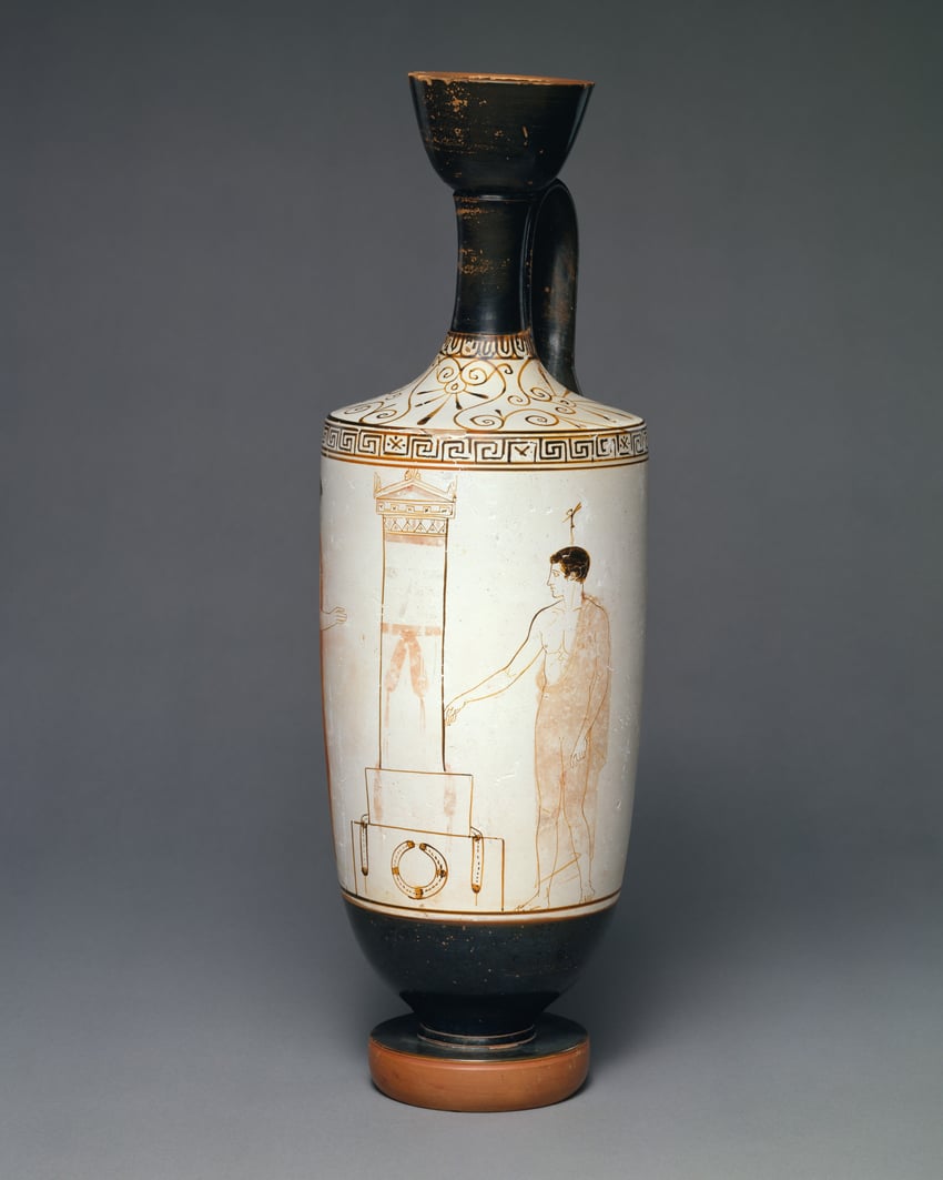 This vase exemplifies Attic white-ground funerary lekythoi at their finest. Funerary representations of the sixth century B.C. depicted the deceased surrounded by mourners. By the middle of the fifth century, the deceased was shown either as living or not at all. The figure at the left is a mourner; the deceased is identifiable by the diminutive soul fluttering above his head.