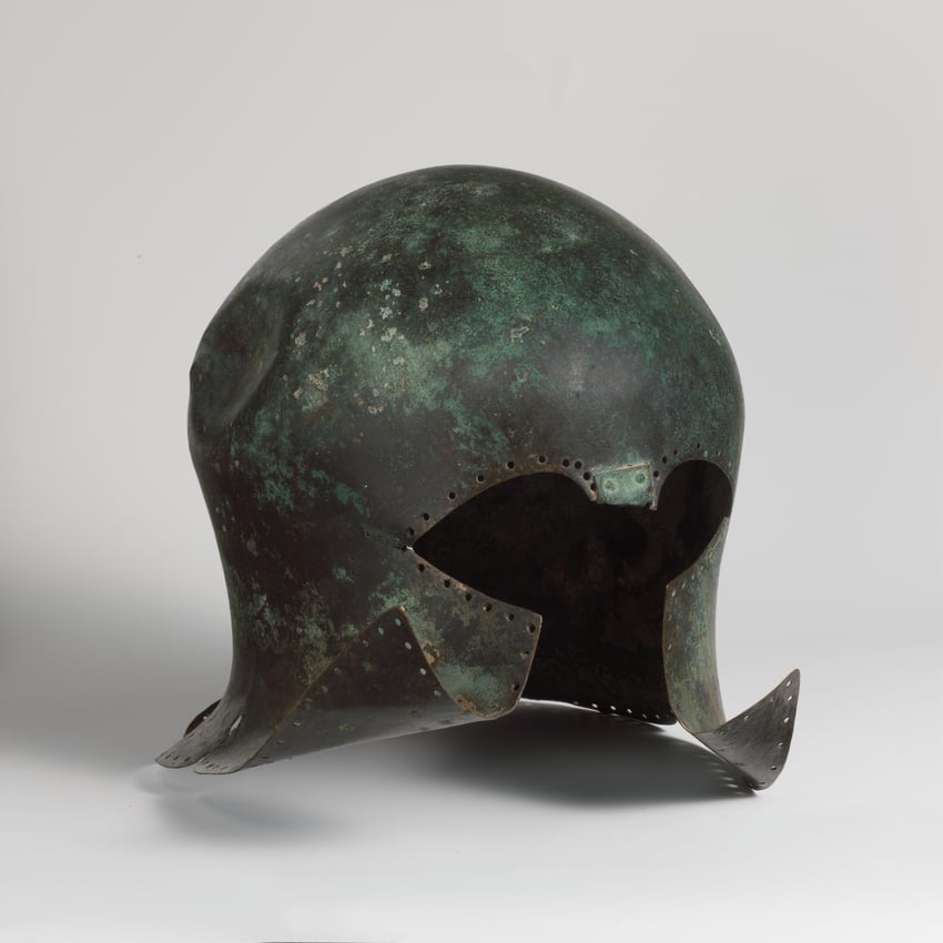 The historian Herodotos mentions the Corinthian helmet as part of the equipment of the Greek hoplite (foot soldier). As a result, the predominant type of helmet, with a rounded calotte, small openings for the eyes, and a distinct nose-piece has been identified as such. Thanks to the large number of examples excavated at Olympia, the typological variety and development are well understood. This example, said to be from Olympia, is quite early, as indicated by its unarticulated edges and the small cutout in the middle of each side.